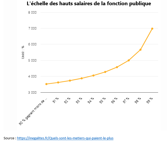 Mais concentrons-nous sur le public. On vous met ce graphique qui illustre bien l’écrasement vers le bas des salaires issus de l’observatoire des inégalités. Dans la fonction publique d’État, le 1 % le mieux rémunéré touche au moins 6 700 euros net par mois et 8 500 euros en moyenne… Mais 99 % touche moins. Et 90 % des agents touchent moins de 3 500 € !