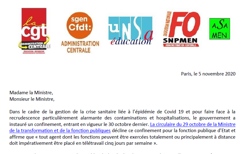Non confinement à l’administration centrale – l’intersyndicale écrit aux ministres
